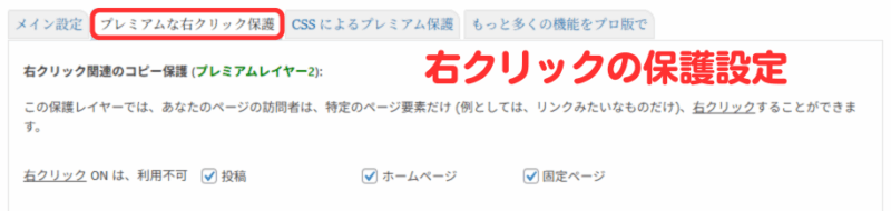 「プレミアムな右クリック保護」の項目では、WEB ページ上での右クリックの操作に制限をかけるための設定を行います。